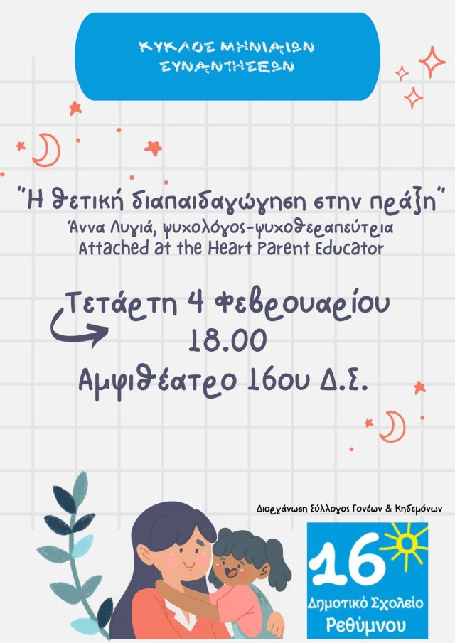 O Σύλλογος Γονέων και Κηδεμόνων του 16ου Δημοτικού Σχολείου Ρεθύμνου διοργανώνει έναν κύκλο μηνιαίων συναντήσεων με την ψυχολόγο – ψυχοθεραπεύτρια – Attached at the Heart Parent Educator, κα Άννα Λυγιά.