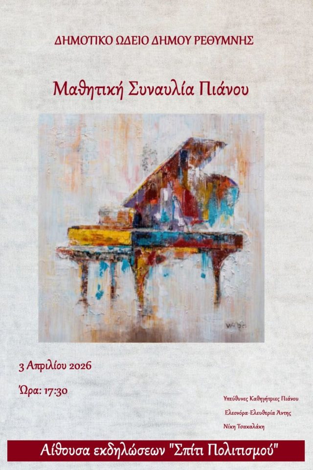 Μια ξεχωριστή μουσική βραδιά με πρωταγωνιστές τους μικρούς και μεγάλους μαθητές πιάνου διοργανώνει το Δημοτικό Ωδείο Ρεθύμνης την Παρασκευή 3 Απριλίου στις 17:30, στο Σπίτι του Πολιτισμού.