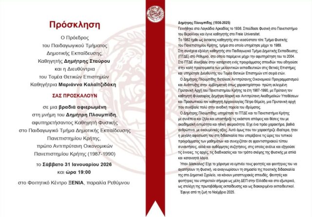Ο Πρόεδρος του Παιδαγωγικού Τμήματος Δημοτικής Εκπαίδευσης του Πανεπιστημίου Κρήτης, Καθ. Δημήτρης Σταύρου και η Διευθύντρια του Τομέα Θετικών Επιστημών, Καθ. Μαριάννα Καλαϊτζιδάκη, σας προσκαλούν σε μια βραδιά αφιερωμένη στη μνήμη του Δημήτρη Πλουμπίδη, αφυπηρετήσαντος Καθηγητή Φυσικής στο Π.Τ.Δ.Ε. του Π.Κ. και πρώτου Αντιπρύτανη Οικονομικών Πανεπιστημίου Κρήτης (1987-1990).