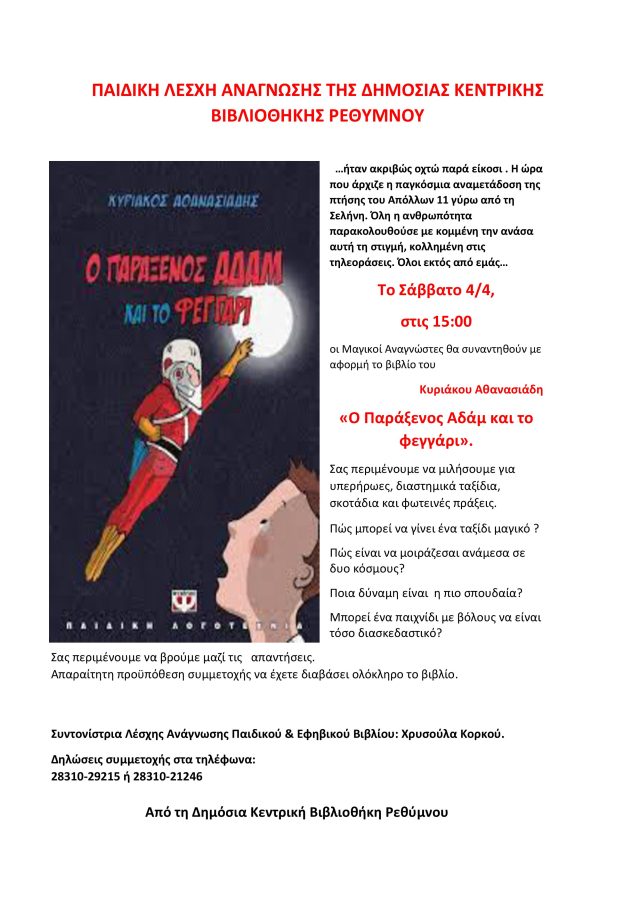 Το Σάββατο 4/4, στις 15:00 οι Μαγικοί Αναγνώστες θα συναντηθούν με αφορμή το βιβλίο του Κυριάκου Αθανασιάδη «Ο Παράξενος Αδάμ και το φεγγάρι».