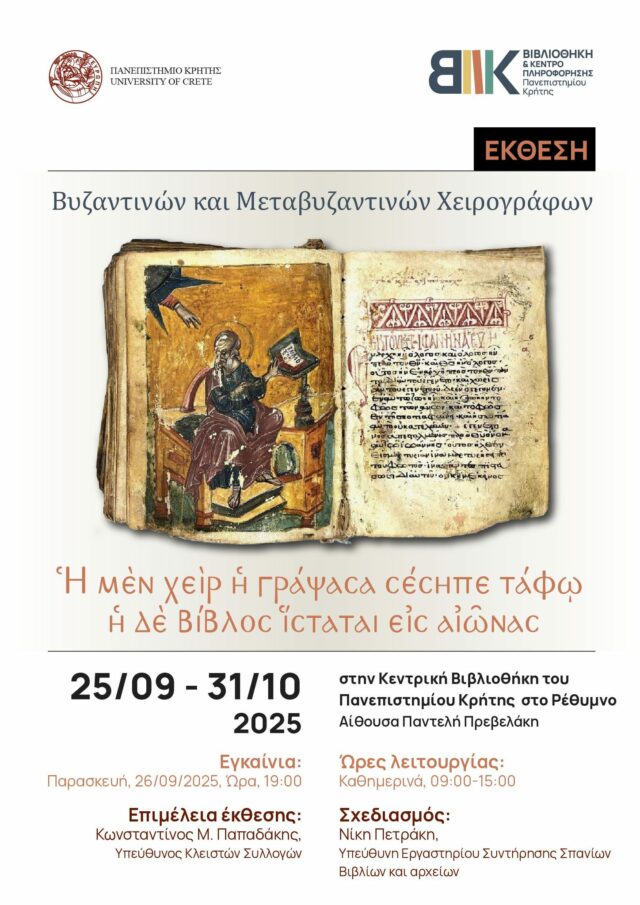 Η Βιβλιοθήκη του Πανεπιστημίου Κρήτης, επί τη ευκαιρία της 12ης Συνάντησης Ελλήνων Βυζαντινολόγων, σας προσκαλεί στα εγκαίνια των εκθέσεων:
