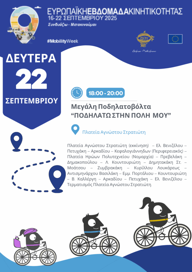 Από Τρίτη 16 έως και Δευτέρα 22 Σεπτεμβρίου 2025, θα υλοποιηθεί ένα πλούσιο πρόγραμμα δράσεων και εκδηλώσεων για μικρούς και μεγάλους και κυρίαρχο στόχο να αναδειχθεί η σημασία της βιώσιμης κινητικότητας, της ενεργής μετακίνησης και της προστασίας του περιβάλλοντος.