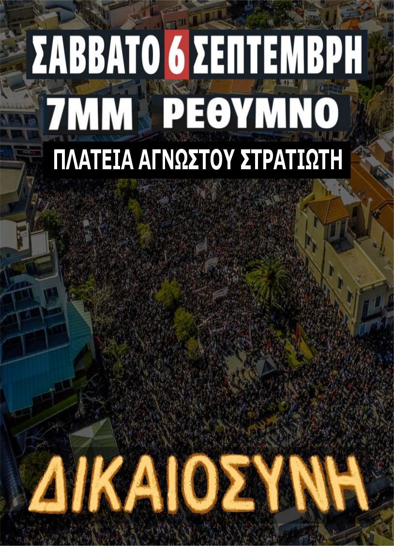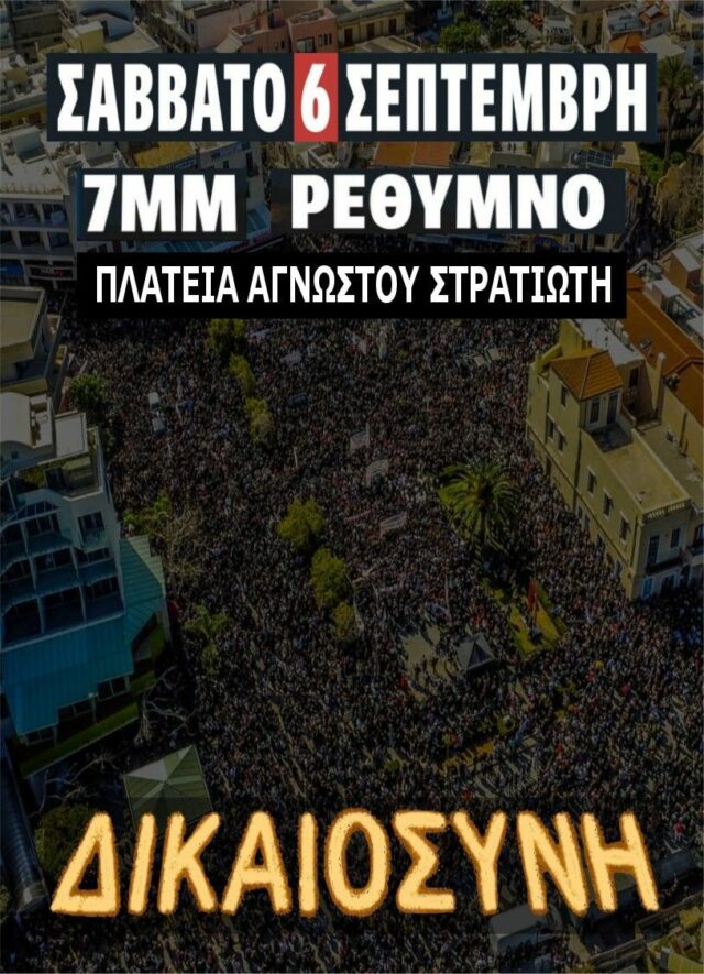Στο ίδιο πνεύμα, κάλεσμα απηύθυνε και το Νομαρχιακό Τμήμα της ΑΔΕΔΥ Ρεθύμνου, τονίζοντας ότι «δεν συμβιβαζόμαστε με τη σιωπή, δεν υποχωρούμε στην αδικία» και διεκδικώντας δικαιοσύνη, αλήθεια και ευθύνη.