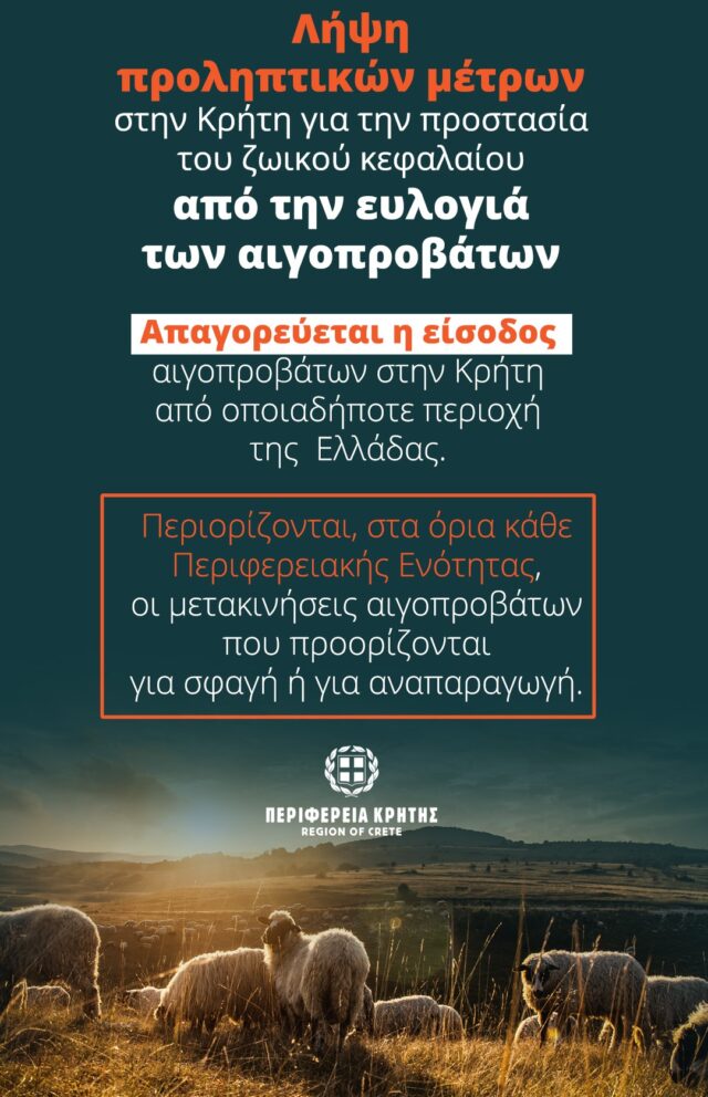 Η Περιφέρεια Κρήτης παρατείνει τα άμεσα, προληπτικά μέτρα για την προστασία της κτηνοτροφίας από τη νόσο της Ευλογιάς των αιγοπροβάτων, η οποία παρουσιάζει αυξημένα κρούσματα στην ηπειρωτική Ελλάδα.
