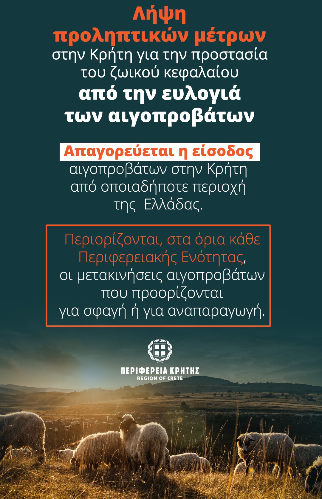 Στα πλαίσια της ανάγκης αποτροπής εισόδου και μετάδοσης, της νόσου της Ευλογιάς του Προβάτου, στη νήσο Κρήτη, λόγω των αυξημένων κρουσμάτων που παρατηρούνται σε διάφορες περιοχές της χώρας, οι Υπηρεσίες μας σας επισημαίνουν την ανάγκη τήρησης προληπτικών αυστηρών μέτρων βιοασφάλειας στις εκτροφές, στα σφαγεία οπληφόρων, κατά τη μεταφορά ζώντων ζώων και ζωοτροφών και κατά τη διακίνηση γάλακτος.