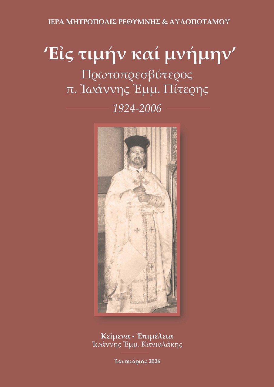 Η Ιερά Μητρόπολη Ρεθύμνης και Αυλοποτάμου και η οικογένεια του μακαριστού Πρωτ. Ιωάννου Πίτερη σας προσκαλούν στην παρουσίαση του βιβλίου υπό τον τίτλο «Εις τιμήν και μνήμην» Πρωτοπρεσβύτερος π. Ιωάννης Εμμ. Πίτερης (1924-2006), που περιλαμβάνει μέρος από το πλούσιο συγγραφικό έργο του.