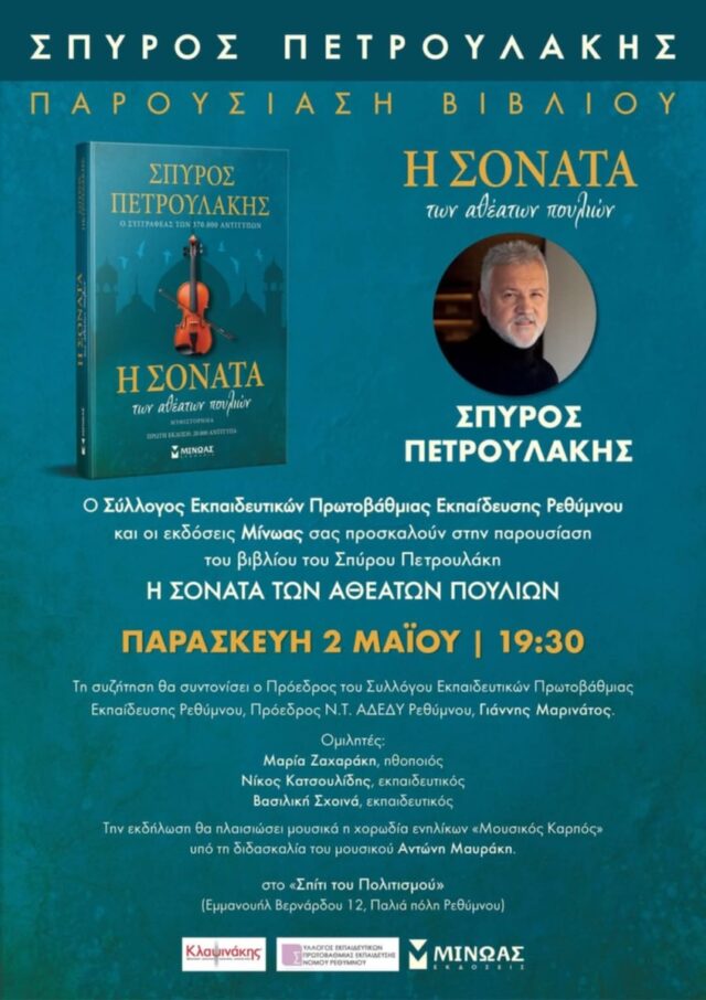 Ο Σύλλογος Εκπαιδευτικών Πρωτοβάθμιας Εκπαίδευσης Ρεθύμνου και εκδόσεις Μίνωας σας προσκαλούν την Παρασκευή 2 Μαΐου και ώρα 19:30, στην παρουσίαση του νέου βιβλίου του Σπύρου Πετρουλάκη, «Η ΣΟΝΑΤΑ ΤΩΝ ΑΘΕΑΤΩΝ ΠΟΥΛΙΩΝ».