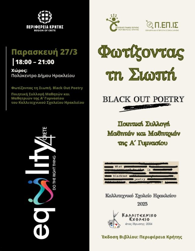 Η Περιφέρεια Κρήτης, σε συνεργασία με το Καλλιτεχνικό Σχολείο Ηρακλείου, με αφορμή την Παγκόσμια Ημέρα Ποίησης, διοργανώνουν την παρουσίαση της ποιητικής συλλογής μαθητών και μαθητριών της Α’ Γυμνασίου, με τίτλο «Φωτίζοντας τη Σιωπή–Black Out Poetry», την Παρασκευή 27 Μαρτίου 2025, από τις 18:00 έως τις 21:00, στο Πολύκεντρο του Δήμου Ηρακλείου.