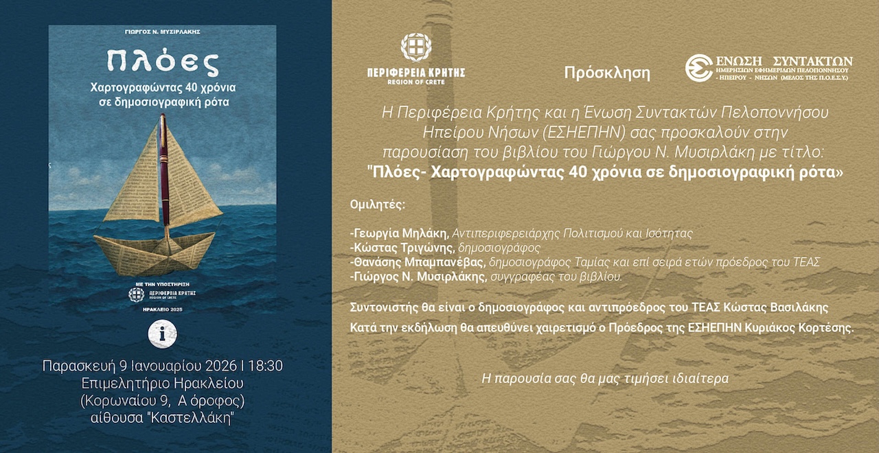 Σαράντα χρόνια δημοσιογραφικής διαδρομής, εμπειριών, αναζητήσεων και καταγραφής της εποχής, συμπυκνώνονται στο βιβλίο του δημοσιογράφου Γιώργου Ν. Μυσιρλάκη με τίτλο «Πλόες – Χαρτογραφώντας 40 χρόνια σε δημοσιογραφική ρότα», το οποίο παρουσιάζουν η Περιφέρεια Κρήτης και η Ένωση Συντακτών Πελοποννήσου, Ηπείρου Νήσων (ΕΣΗΕΠΗΝ).