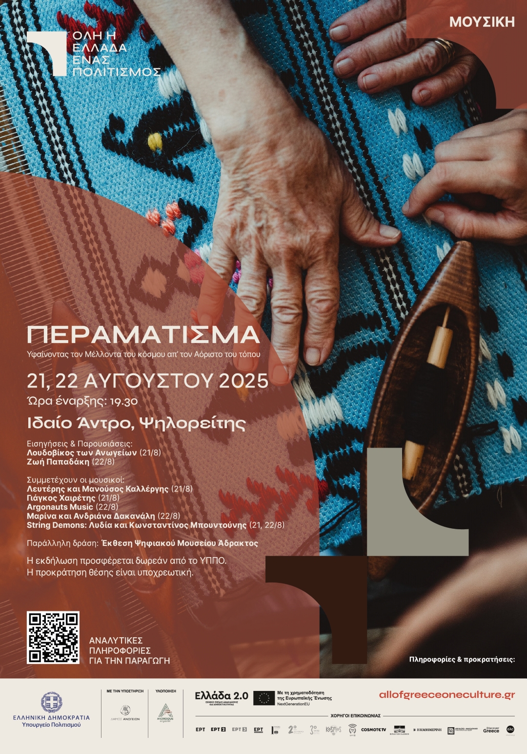 Μια πολιτιστική πρόταση, εμπνευσμένη από τη διαχρονική τελετουργία του περαματίσματος στον παραδοσιακό αργαλειό – τη διαδικασία του «περάσματος» των νημάτων που καθορίζει το σχέδιο και την τεχνοτροπία κάθε υφαντού. Ως έννοια, το περαμάτισμα μετατρέπεται σε εργαλείο κατανόησης της συνύφανσης του τοπικού με το παγκόσμιο, της παράδοσης με την καινοτομία, του χρόνου με τον χώρο, του ανθρώπου με την ύλη και την τεχνολογία.