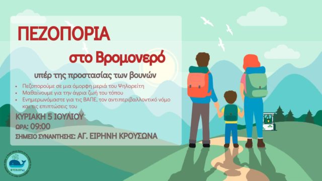 Την Κυριακή 5 Ιουλίου, καλούμε όλους/ες όσοι/ες νοιάζεστε για το μέλλον της Κρήτης και της Ελλάδας, εσάς που αγωνιάτε για την προστασία της φύσης μας, σε μια εύκολη πεζοπορία στο νοτιοανατολικό τμήμα του Ψηλορείτη, «Αγία Ειρήνη – Βρομονερό», μισή μόλις ώρα μακριά από το Ηράκλειο.