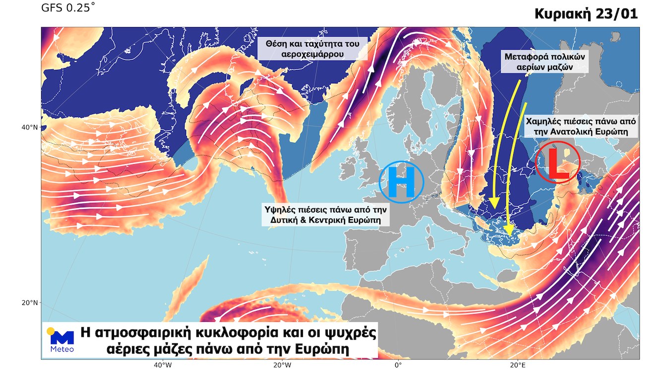 Αιτία για αυτή τη σημαντική ψυχρή εισβολή είναι ο έντονος κυματισμός του αεροχειμάρρου πάνω από την Ευρώπη. Ο αεροχείμαρρος είναι ένα ισχυρό ρεύμα αέρα σε ύψος περίπου 10 χιλιομέτρων από την επιφάνεια της γης με κίνηση από τα δυτικά προς τα ανατολικά. Ο αεροχείμαρρος εντοπίζεται σε περιοχές όπου υπάρχει έντονη θερμοκρασιακή διάφορα μεταξύ δυο αερίων μαζών, ενώ η κίνηση του αεροχειμάρρου καθορίζει την δημιουργία και τη κίνηση των βαρομετρικών συστημάτων.