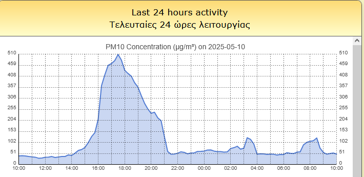 Οι συγκεντρώσεις αιωρούμενων σωματιδίων ήταν πολύ υψηλές στην Κρήτη την Παρασκευή 09/05. Ο σταθμός ποιότητας αέρα που λειτουργεί από το Meteo.gr/Εθνικό Αστεροσκοπείο Αθηνών στο Δημαρχείο Ρεθύμνου (ως μέρος του Ολοκληρωμένου Συστήματος Παρακολούθησης Καιρικών Συνθηκών Ρεθύμνου) κατέγραψε το μεσημέρι/απόγευμα της Παρασκευής συγκεντρώσεις που προσέγγισαν τα 300 μικρογραμμάρια/κυβικό μέτρο (βλ. διάγραμμα παρακάτω).