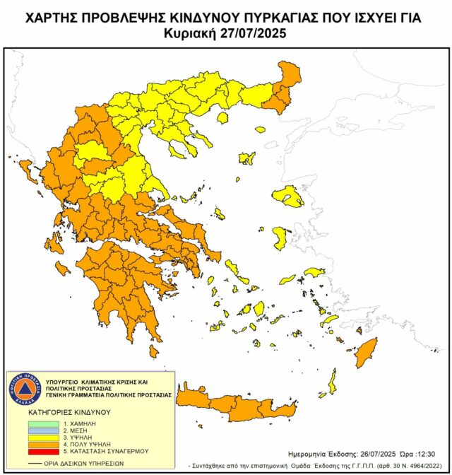Η Πολιτική Προστασία Περιφέρειας Κρήτης ενημερώνει ότι, σύμφωνα με τον ημερήσιο Χάρτη Πρόβλεψης Κινδύνου Πυρκαγιάς της Γενικής Γραμματείας Πολιτικής Προστασίας, για αύριο Κυριακή 27 Ιουλίου 2025 η κατηγορία Κινδύνου Πυρκαγιάς για όλη την Κρήτη, είναι κατηγορίας κινδύνου 4 (πολύ υψηλός).