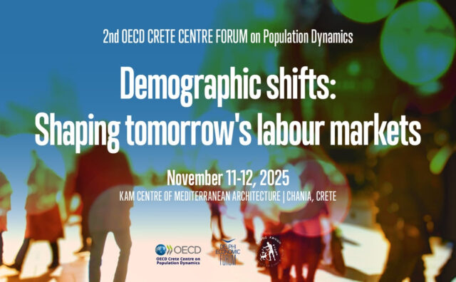 Το Κέντρο Κρήτης του ΟΟΣΑ για τη Δυναμική των Πληθυσμών ανακοινώνει το 2ο Διεθνές Ετήσιο Συνέδριό του με τίτλο «Η πρόκληση του δημογραφικού: Διαμορφώνοντας την αγορά εργασίας του μέλλοντος». Το Συνέδριο είναι μια συνδιοργάνωση του Κέντρου Κρήτης του ΟΟΣΑ για τη Δυναμική των Πληθυσμών, του Οικονομικού Φόρουμ των Δελφών και του Δήμου Χανίων και για δεύτερη συνεχόμενη χρονιά θα πραγματοποιηθεί στο Κέντρο Αρχιτεκτονικής της Μεσογείου στα Χανιά, την Τρίτη 11 και την Τετάρτη 12 Νοεμβρίου 2025.