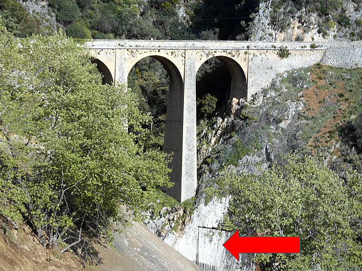 Η κατάσταση των δύο πρώτων είναι γνωστή. Ευτυχώς τώρα τελευταία κάτι φαίνεται να γίνεται μ’ αυτά, μετά από μια μακρόχρονη περίοδο εγκατάλειψης. Σ’ ότι αφορά όμως την Καμάρα, προ ημερών, οδεύοντας με φίλους προς το Βένι, είδα έκπληκτος να συντελείται μια απομνημειοποίηση. Είδα δηλαδή να προσπαθούν να θεμελιώσουν τη γέφυρα του νέου δρόμου, όποτε αυτός τελειώσει, όχι σε απόσταση 50-100 μέτρων τουλάχιστον, ώστε η εικόνα της ιστορικής λιθόκτιστης γέφυρας του 1911-1914 να μη καλυφθεί από τη νέα. Όχι, τα μηχανήματα εργάζονταν για ένα βάθρο σε απόσταση το πολύ δύο μέτρων, έχοντας αφαιρέσει μέρος του βραχόλοφου, στον οποίο σημειωτέον εδράζεται το ένα από τα δύο μεσαία βάθρα της ιστορικής γέφυρας. Πάνω στον βράχο αυτό διατηρούνται εγχάρακτα τα σημάδια δημιουργίας οπών (για τοποθέτηση εκρηκτικών υλών; Από εκσκαφή με σφύρα;), προκειμένου να αφαιρεθεί σημαντικό τμήμα του, σημάδια που αποτυπώνει η διπλανή φωτογραφία.