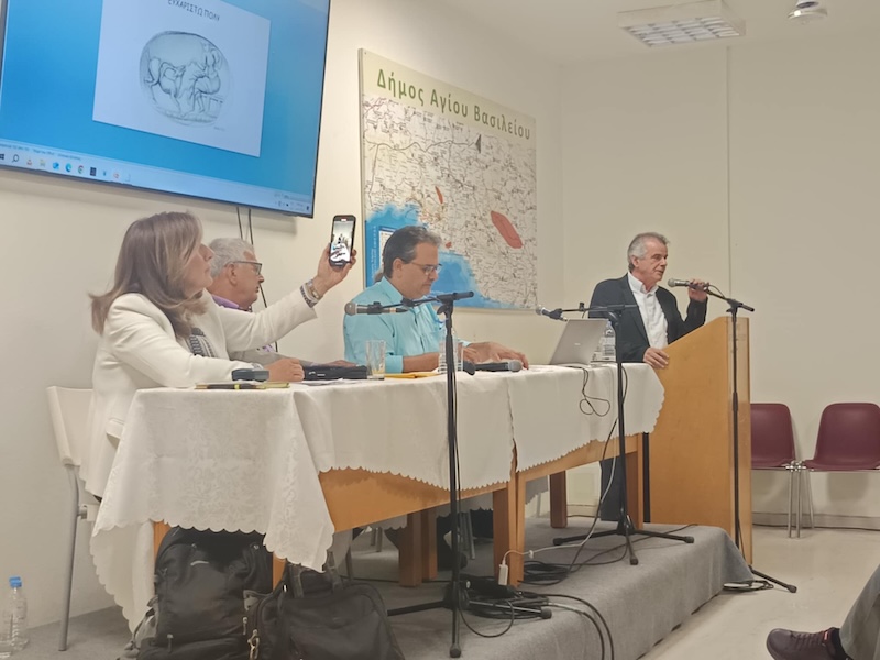 Η εκδήλωση συνεχίστηκε με την παρουσίαση του κ. Σταύρου Καπριδάκη, ο οποίος επικεντρώθηκε στην κληρονομιά ή αλλιώς τον “Απόηχο”, του τρόπου ζωής των Μινωιτών, του πολιτισμού, των τεχνών, των ηθών, της θρησκείας, της Λατρείας και της Αγροτικής ζωής, στην σημερινή Κρήτη. Έφερε αρχικά ως παράδειγμα καθώς τη Μινωική Σφραγιδογλυφία, καθώς πολλές από τις περιγραφές των σφραγισμάτων, που σχετίζονται με την τότε ζωή στην Κρήτη, έχουν διατηρηθεί ακόμη και στις μέρες μας και μέχρι πριν λίγα χρόνια ήταν σχεδόν ίδια όπως τότε. Στη συνέχεια υποστήριξε ότι το εκφορικό σύστημα των πρώτων θολωτών τάφων από τη Δυτ. Μεσαρά, χρησιμοποιείται ακόμη για την κατασκευή των κούμων στα Μητάτα του Ψηλορείτη και των Λευκών Ορέων (Μαδάρας). Ιδιαίτερη αίσθηση έκανε η παρουσίαση του σφραγίσματος από την Αρχαία Κυδωνία που δείχνει δύο βοσκούς να αρμέγουν αίγες, με το γνωστό τρόπο που αρμέγουν ακόμη μόνο στην Κρήτη, που σημαίνει ότι αυτός ο τρόπος είναι χαρακτηριστικό μόνο της Κρήτης και δεν ήρθε από κάποιο άλλο μέρος, σε μεταγενέστερο χρόνο. Ο ομιλητής αναφέρθηκε ακόμα σε μια σειρά σφραγισμάτων που σχετίζονται με λατρευτικές συνήθειες. Η παρουσίαση του κ. Καπριδάκη ολοκληρώθηκε με την συσχέτιση μερικών μαγικών μοτίβων από Μινωικά σφραγίσματα με το έθιμο των Λεγομένων Πατητών στα Σφακιά. Πρόκειται για ειδικά “Κουλούρια Γάμου“, τα οποία παρασκευάζονται ακόμη και στις μέρες μας.