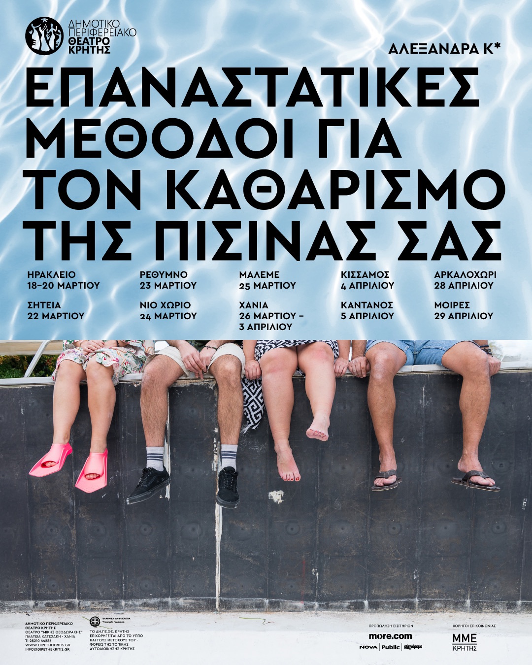 Η παράσταση «Επαναστατικές μέθοδοι για τον καθαρισμό της πισίνας σας» της Αλεξάνδρας Κ*, πρώτη θεατρική παραγωγή του ΔΗΠΕΘΕ Κρήτης για το 2025, θα κάνει πρεμιέρα στο Ηράκλειο, στο Πειραματικό Θέατρο του Πολιτιστικού και Συνεδριακού Κέντρου στις 18 Μαρτίου, σε σκηνοθεσία Σοφίας Δερμιτζάκη.