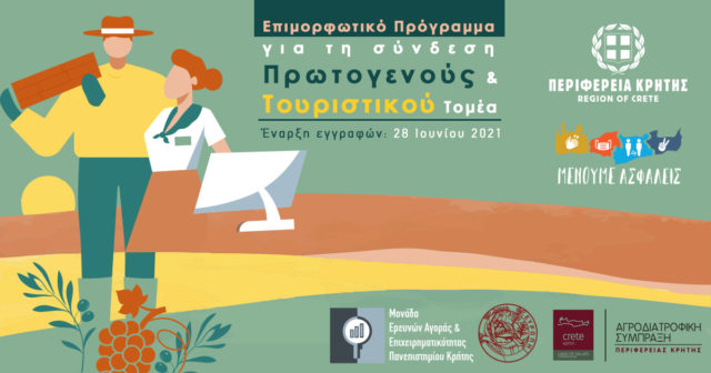 Η Περιφέρεια Κρήτης και το Πανεπιστήμιο Κρήτης ξεκινούν την υλοποίηση επιμορφωτικού προγράμματος, μεγάλης κλίμακος, με τίτλο «Επιμορφωτικό Πρόγραμμα για τη σύνδεση Πρωτογενούς και Τουριστικού Τομέα», το οποίο σχεδιάστηκε με βάση τα δεδομένα της Διάγνωσης Αναγκών του Περιφερειακού Μηχανισμού Παρακολούθησης της Αγοράς Εργασίας στην Κρήτη. Στην υλοποίηση του Επιμορφωτικού Προγράμματος θα συμβάλει η Αγροδιατροφική Σύμπραξη Περιφέρειας Κρήτης.