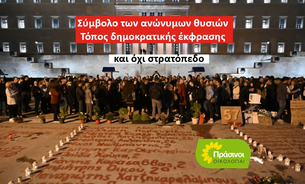 Οι ΠΡΑΣΙΝΟΙ -Οικολογία τονίζουν ότι το Μνημείο του Αγνώστου Στρατιώτη δεν είναι στρατόπεδο, προσιτό μόνο σε αγήματα. Είναι δημόσιος χώρος δίπλα στη Βουλή, χώρος μνήμης, ιστορίας και δημοκρατικής συλλογικής έκφρασης.