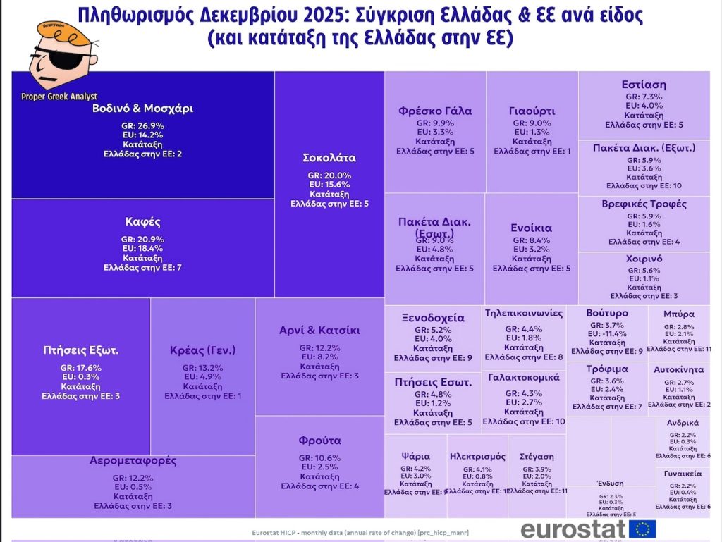 Σοκαριστικά στοιχεία για το κόστος ζωής στην Ελλάδα αποκαλύπτει πρόσφατη έρευνα για τον ετήσιο πληθωρισμό του Δεκεμβρίου 2025, φέρνοντας τη χώρα στις πρώτες θέσεις της Ευρωπαϊκής Ένωσης σε αυξήσεις τιμών βασικών αγαθών και υπηρεσιών.