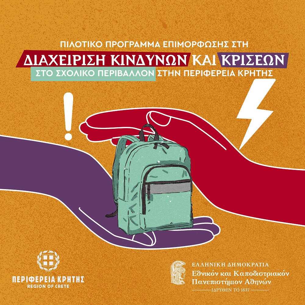 Με ιδιαίτερη επιτυχία ολοκληρώθηκε το «Πιλοτικό Πρόγραμμα Επιμόρφωσης στη Διαχείριση Κινδύνων και Κρίσεων στο Σχολικό Περιβάλλον στην Περιφέρεια Κρήτης», μία πρωτοποριακή δράση της Περιφέρειας Κρήτης που υλοποιείται σε συνεργασία με το Εθνικό και Καποδιστριακό Πανεπιστήμιο Αθηνών. Στο πρόγραμμα συμμετείχαν πιλοτικά 40 σχολικές μονάδες από όλη την Κρήτη, με στόχο την εκπαίδευση εκπαιδευτικών στη διαχείριση φυσικών, τεχνολογικών και ανθρωπογενών κινδύνων και κρίσεων στο σχολικό περιβάλλον, εξετάζοντας τόσο τα φαινόμενα και τις επιπτώσεις τους, όσο και το σχετικό θεσμικό πλαίσιο και την ψυχοκοινωνική διαχείρισή τους.