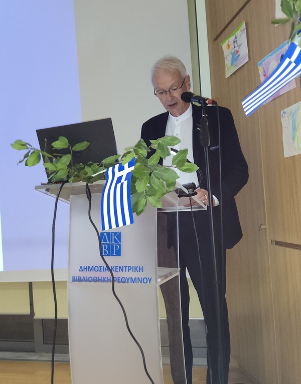 Στην αρχή της εκδήλωσης χαιρετισμούς απηύθυναν ο Πρόεδρος και ο Αντιπρόεδρος του Εφορευτικού Συμβουλίου της Βιβλιοθήκης, καθηγητής Κωνσταντίνος Σπανουδάκης και Νικόλαος Δερεδάκης αντίστοιχα, κάνοντας αναφορές στις δράσεις και εκδηλώσεις του Ιδρύματος που θα ακολουθήσουν το επόμενο διάστημα.