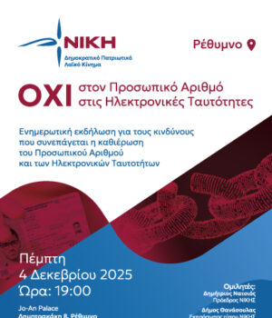 Το Δημοκρατικό Πατριωτικό Λαϊκό Κίνημα ΝΙΚΗ διοργανώνει στο Ρέθυμνο ενημερωτική εκδήλωση για τους κινδύνους που απορρέουν από την καθιέρωση του Προσωπικού Αριθμού και των Ηλεκτρονικών Ταυτοτήτων, την Πέμπτη 4 Δεκεμβρίου 2025, ώρα 19:00, στο ξενοδοχείο Jo–An Palace, (Δημητρακάκη 8).