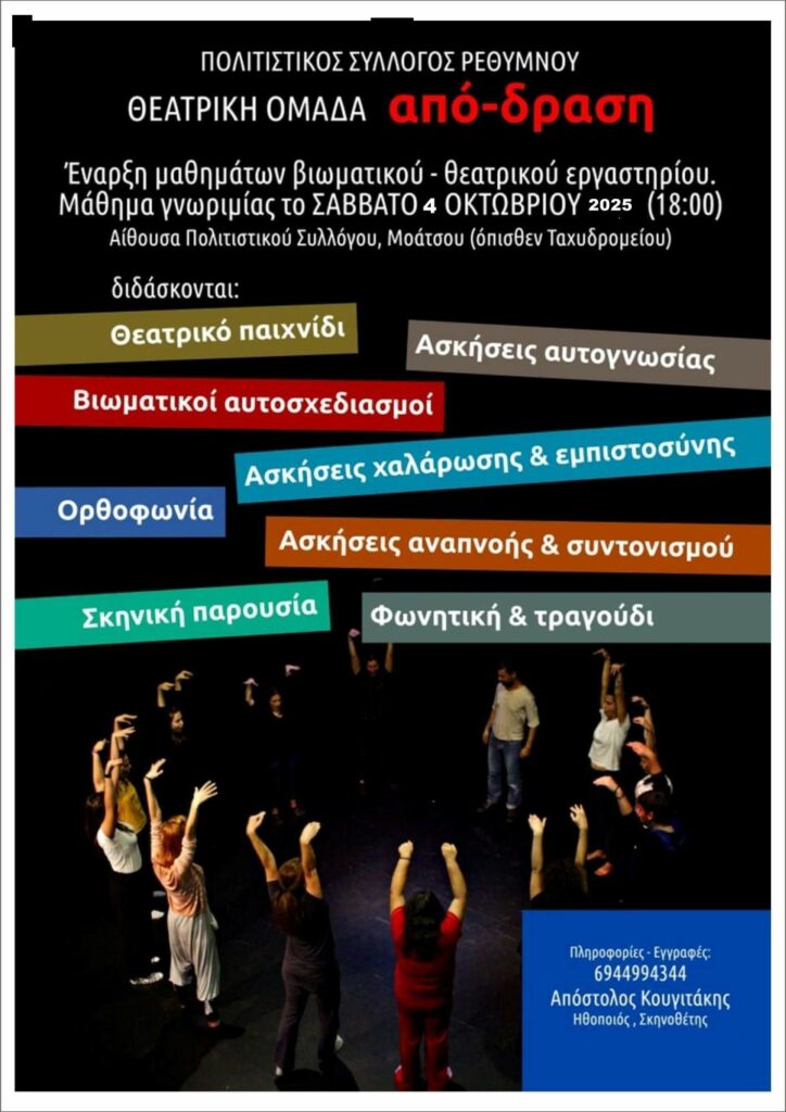 Η θεατρική ομάδα Απόδραση του Πολιτιστικού συλλόγου Ρεθύμνου συνεχίζει με έργα που εστιάζουν στην ψυχολογική και κοινωνική θεματολογία, δίνοντας έμφαση στη συλλογική δημιουργία και την ενεργή συμμετοχή του κοινού.