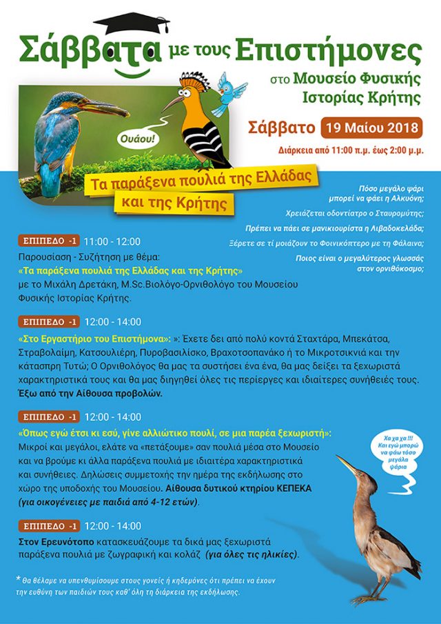 Ελάτε το Σάββατο 19 Μαΐου 2018 στο Μουσείο Φυσικής Ιστορίας Κρήτης του Πανεπιστημίου Κρήτης για να γνωρίσετε έναν επιστήμονα και να συζητήσετε μαζί του για τα παράξενα πουλιά της Ελλάδας και της Κρήτης.