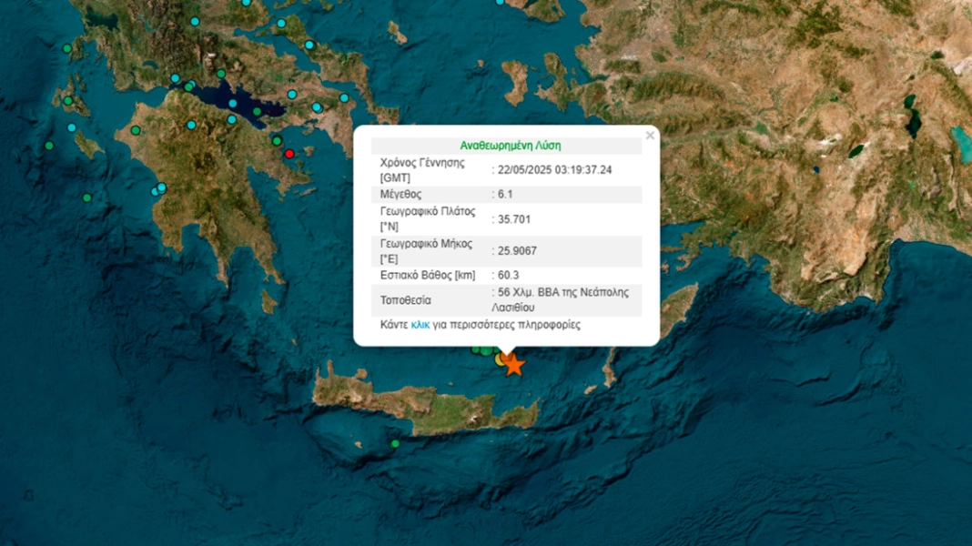 Ισχυρός σεισμός 6,1 βαθμών της κλίμακας Ρίχτερ σημειώθηκε στις 6:19 το πρωί στην Κρήτη. Ο σεισμός είχε μεγάλο εστιακό βάθος και σημειώθηκε ανοιχτά του Λασιθίου στην Κρήτη