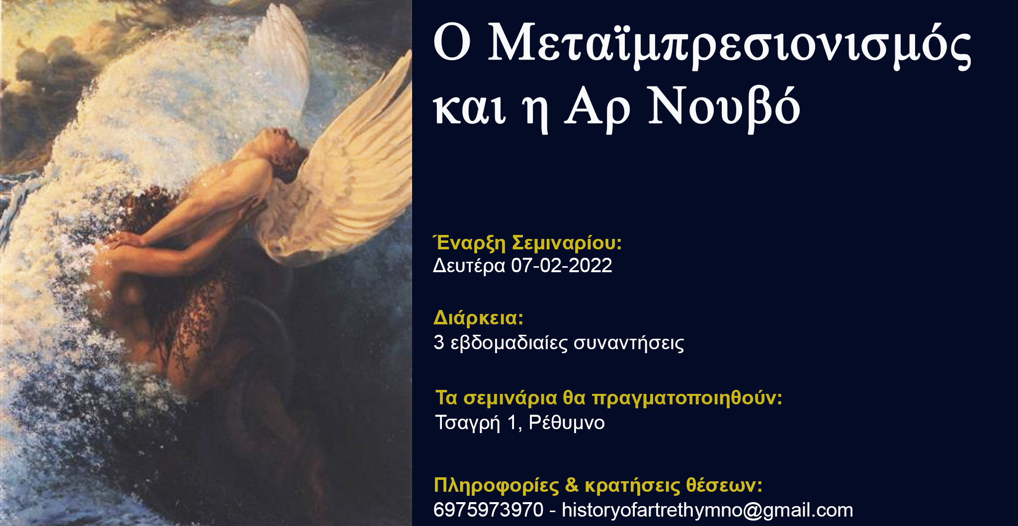 Το σεμινάριο αφορά τον Μεταϊμπρεσιονισμό και την Αρ Νουβό.Κατά τη διάρκεια των 3 συναντήσεων θα παρουσιαστεί η εξέλιξη των δύο στην πάροδο των χρόνων, από τα τέλη του 19ου αιώνα μέχρι τη δεύτερη δεκαετία του 20ου.