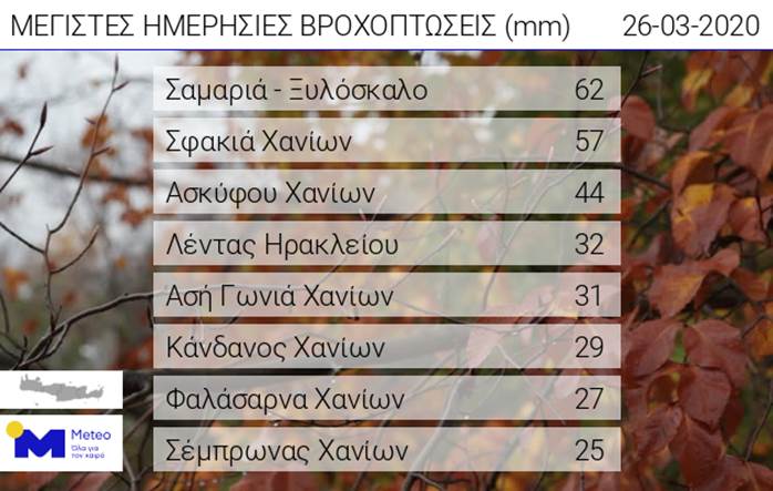 Όπως είχαμε προειδοποιήσει από χθες, σημαντικά ύψη βροχής κατέγραψαν οι σταθμοί του Εθνικού Αστεροσκοπείο Αθηνών/meteo.gr, κυρίως στην Δυτική Κρήτη μέχρι το μεσημέρι της Πέμπτης 26/03, όπως φαίνεται και στον πίνακα που παρουσιάζουμε.
