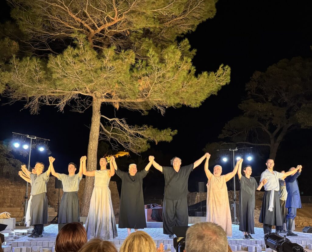 Αυτό που εμπόδισε την παράσταση να απογειωθεί πραγματικά έχει να κάνει με το κομμάτι της χορογραφημένης κίνησης που είχε επιλεχθεί. Οι – πολύ καλά δουλεμένες και όπου χρειαζόταν συγχρονισμένες – στυλιζαρισμένες κινήσεις (χορού και ρόλων) και τα σχηματικά μοτίβα έμειναν στην επιφάνεια. Κάποια από αυτά γίνονταν επιτηδευμένα, χωρίς να γίνεται σαφής η σχέση τους με τη στιγμή, χωρίς να αποκτήσουν την εσωτερική ένταση που θα μπορούσε να απογειώσει τη σκηνική δράση. Το χορικό με τον “πυρρίχιο” χορό φάνηκε ασύνδετο και λίγο αμήχανα εκτελεσμένο.