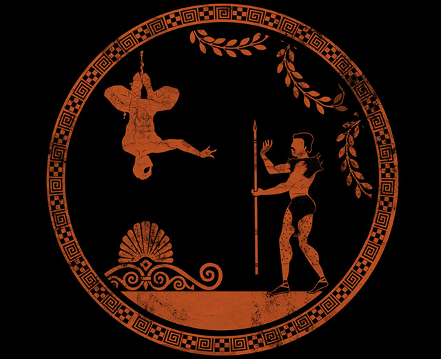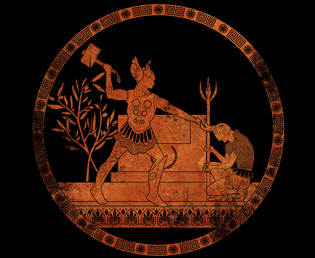 Ο καλλιτέχνης, προφανώς επηρεασμένος από τις πάμπολλες μορφές στους αρχαίους Ελληνικούς αμφορείς, είπε να δοκιμάσει τη δική του εκδοχή και τοποθέτησε τον Batman, τον Spiderman και τον Thor, τους ήρωες της Marvel και της DC, σε πορτοκαλί με μαύρο φόντο, λες και οι μορφές είναι ζωγραφισμένες στον πηλό, με την τεχνική της ερυθρόμορφης αγγειογραφίας.
