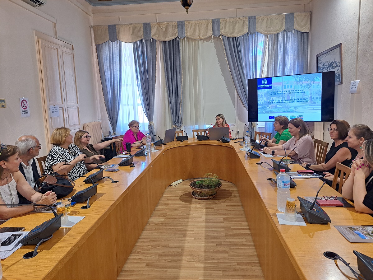 Η Αντιπεριφερειάρχης Ρεθύμνης, κα Μαρία Λιονή καλωσόρισε την Προϊσταμένη της Διαχειριστικής Αρχής της Περιφέρειας Κρήτης, κα Μαρία Κασσωτάκη, τα στελέχη της Υπηρεσίας και τους εκπροσώπους της Ευρωπαϊκής Επιτροπής και μαζί με την Προϊσταμένη της Διεύθυνσης Τεχνικών Υπηρεσιών της Περιφέρειας Κρήτης, κα Ελένη Ρανουτσάκη και τους Μηχανικούς της Υπηρεσίας παρουσίασαν το έργο της ενεργειακής αναβάθμισης του κτιρίου της Π.Ε. Ρεθύμνης.