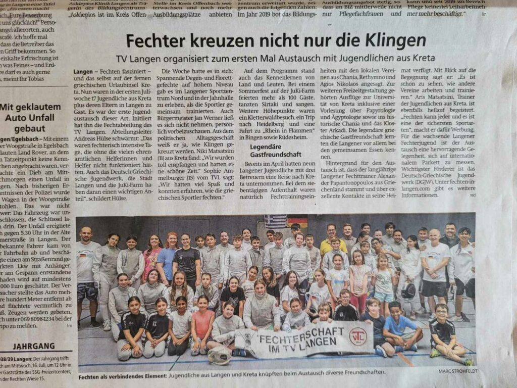 Η Γερμανική 13μελής αποστολή βρέθηκε στο Ρέθυμνο από 10 έως 17 Απριλίου, όπου προπονήθηκε στο 2ο Crete Fencing Camp (12-13 Απριλίου) με ξιφομάχους από όλη την Κρήτη, εκεί μάλιστα ο Πρόεδρος και ο προπονητής του Γερμανικού συλλόγου είχαν τη χαρά να γνωρίσουν, να συνομιλήσουν και να ανταλλάξουν αθλητικές απόψεις με τον Αντιδήμαρχο αθλητισμού Κο Προβιά, ο οποίος στήριξε το όλο εγχείρημα από την αρχή. Επίσης, η Γερμανική αποστολή επισκέφτηκε την ιστορική μονή Αρκαδίου, το Πανεπιστήμιο Κρήτης όπου είδε ανεκτίμητους αρχαιολογικούς θησαυρούς, την παλιά πόλη των Χανίων και φυσικά απόλαυσε την Κρητική φιλοξενία την οποία και χαρακτήρισε «Θρυλική» στην τοπική εφημερίδα του Langen.