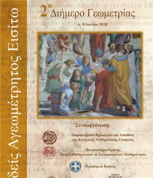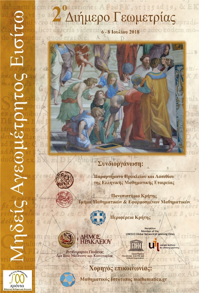 Στο πλαίσιο συμπλήρωσης των 100 χρόνων από την ίδρυση της Ελληνικής Μαθηματικής Εταιρείας και του έτους Μαθηματικών που έχει οριστεί το 2018 τα παραρτήματα Ηρακλείου και Λασιθίου της Ελληνικής Μαθηματικής Εταιρείας, το τμήμα Μαθηματικών και Εφαρμοσμένων Μαθηματικών του Πανεπιστημίου Κρήτης με την συνδιοργάνωση της Περιφέρειας Κρήτης και του Δήμου Ηρακλείου πραγματοποιούν το «2ο Διήμερο Γεωμετρίας» από τις 6 έως τις 8 Ιουλίου στο Πολιτιστικό Κέντρο Ηρακλείου.