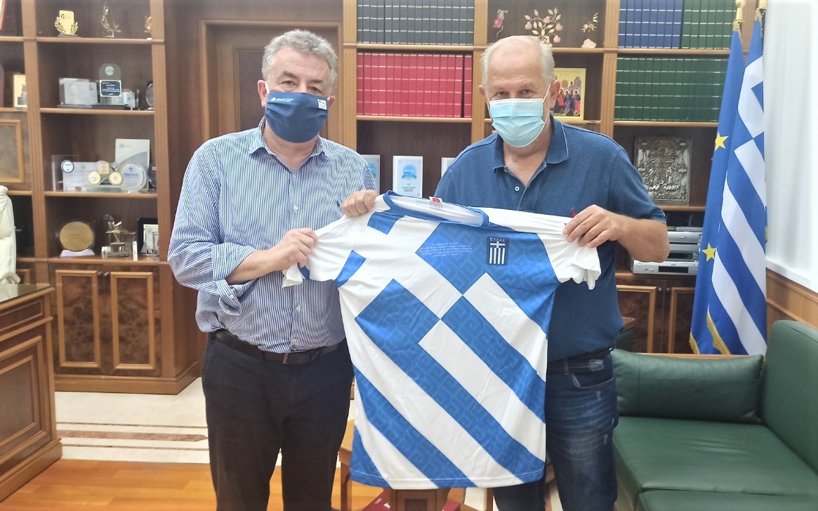 Τη νέα φανέλα των Ελλήνων φιλάθλων της Εθνικής μας ομάδας που φέρει το Εθνόσημο, τον Εθνικό ύμνο, το λογότυπο της Περιφέρειας Κρήτης και διακινείται ήδη στον Ελληνισμό όπου γης,δώρησε στον Περιφερειάρχη Κρήτης Σταύρο Αρναουτάκη, ο Πρόεδρος των Ελλήνων φιλάθλων«Γαλανόλευκος φάρος» Νίκος Φλέκας.
