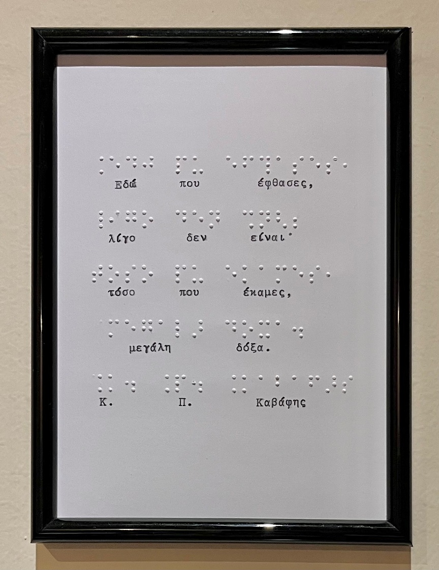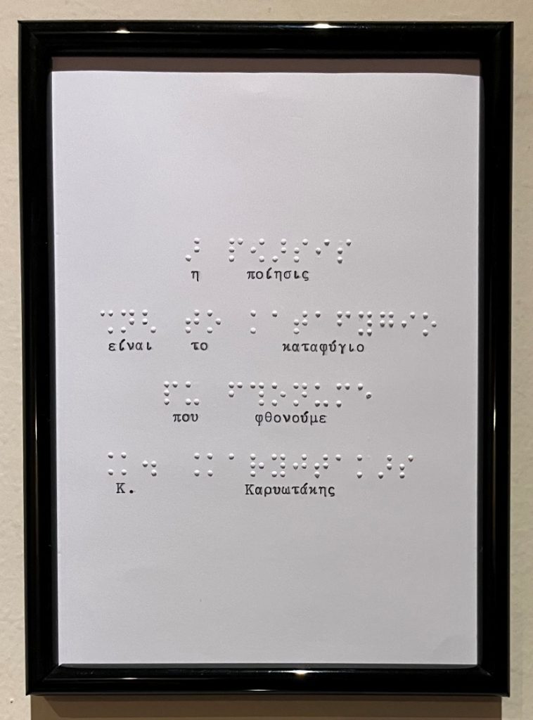 Η έκθεση αποτελεί ένα προσβάσιμο ταξίδι στον κόσμο της ποίησης, όπου οι λέξεις αποκτούν απτική διάσταση. Μέσα από στίχους αγαπημένων ποιημάτων, αποτυπωμένους τόσο στο σύστημα γραφής και ανάγνωσης Braille όσο και σε μορφή για βλέποντες, το έργο επιχειρεί να γεφυρώσει διαφορετικούς τρόπους αντίληψης και εμπειρίας της τέχνης.