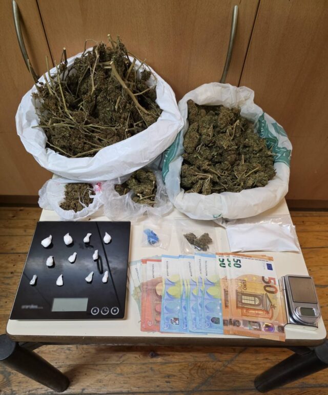 Κατά την αστυνομική επιχείρηση ο 44χρονος εντοπίστηκε να προμηθεύει ναρκωτικά σε δύο 17χρονους, ενώ σε έρευνες στο σπίτι του 44χρονου και του 34χρονου συγκάτοικου του, βρέθηκαν περίπου 842 γραμμάρια κάνναβης, μικροποσότητα κοκαΐνης, ζυγαριά ακριβείας και μαγειρική σόδα, που φέρεται να χρησιμοποιούσαν για τη νόθευση των ουσιών.