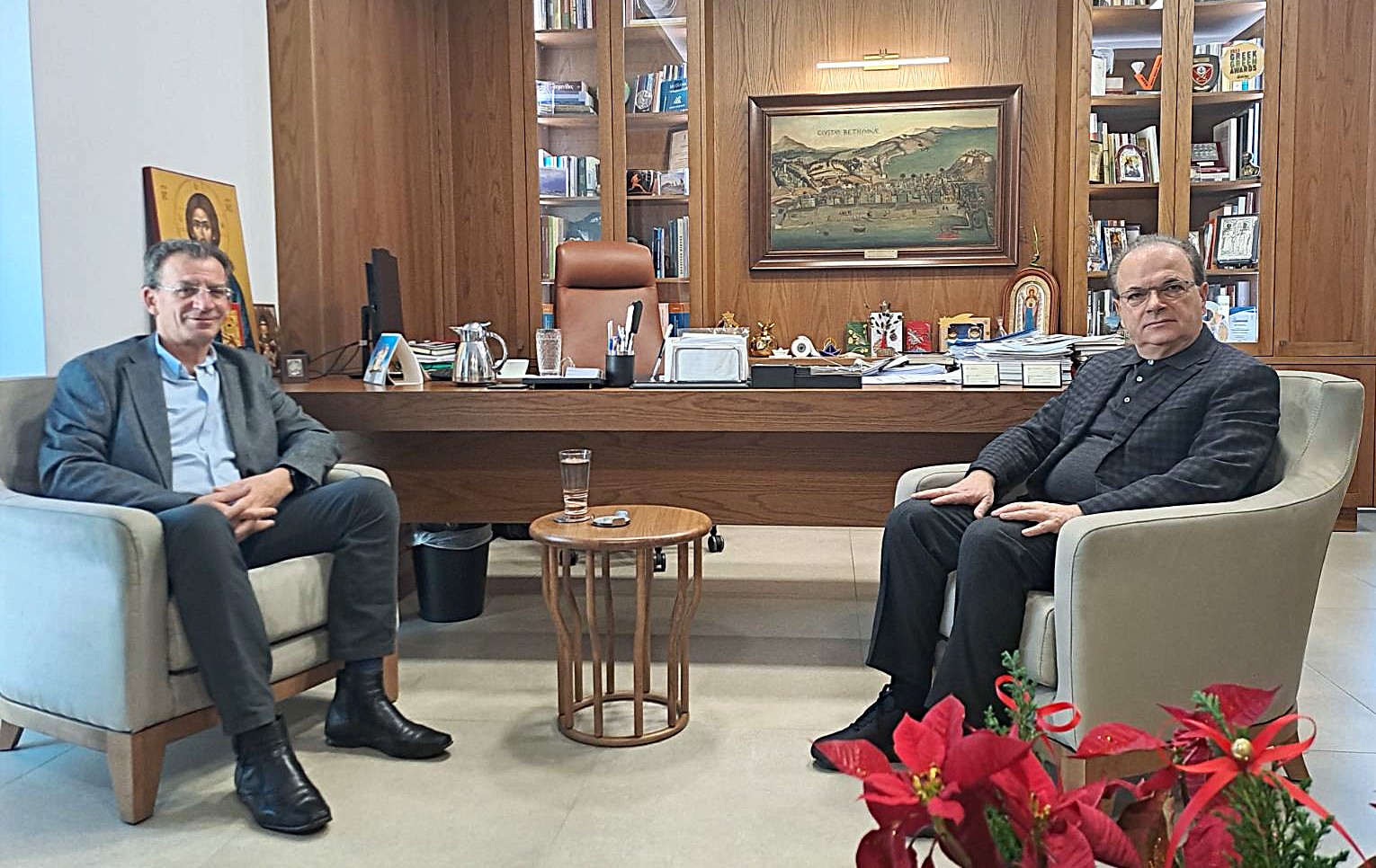 Το νέο Διοικητή του Γενικού Νοσοκομείου Ρεθύμνου Νοσοκομείου Ρεθύμνου Δρ  Γιώργο Παπακωνσταντή υποδέχθηκε σήμερα στο γραφείο του ο Δήμαρχος Ρεθύμνης Γιώργης Μαρινάκης.