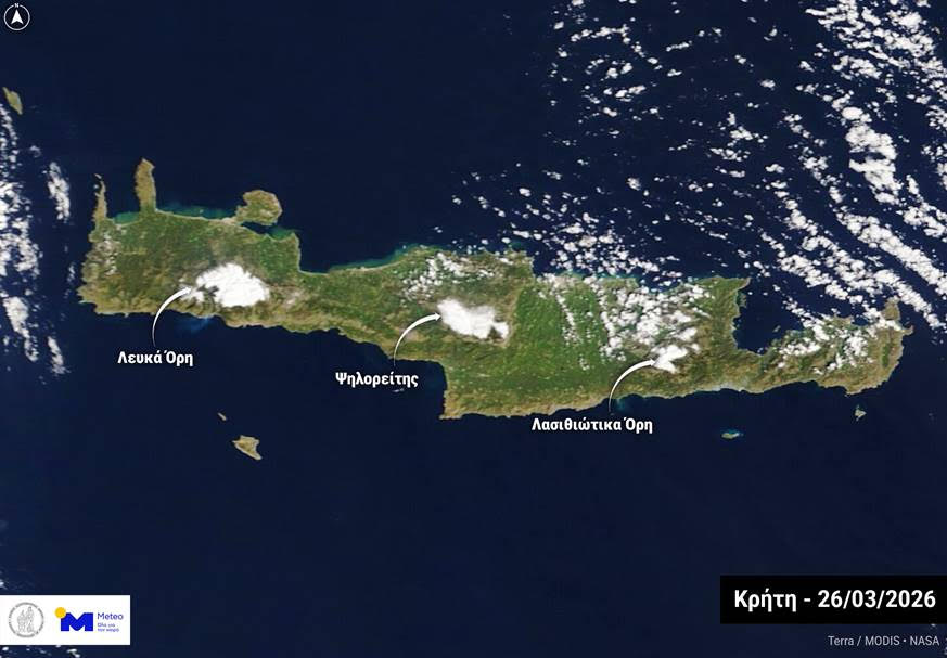 Οι καλές καιρικές συνθήκες της Πέμπτης 26/03 επέτρεψαν την αποτύπωση των χιονισμένων βουνών της Κρήτης μετά την παρατεταμένη κακοκαιρία που επηρέασε το νησί μέσα στο τρίτο δεκαήμερο του Μαρτίου.