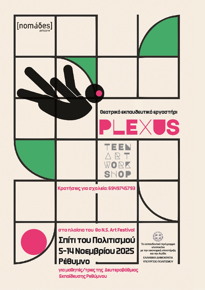 Το καλλιτεχνικό εργαστήρι Plexus επιχορηγείται από το ΥΠΠΟΑ, στο πλαίσιο του Προγράμματος ‘’Δημιουργική Ελλάδα – Επιχορηγήσεις Σύγχρονου Πολιτισμού 2025’’ για “Πολιτιστικές δράσεις και προγράμματα που απευθύνονται σε παιδιά και εφήβους” και προσφέρεται ΔΩΡΕΑΝ στους μαθητές γυμνασίου και λυκείου του νομού Ρεθύμνης.