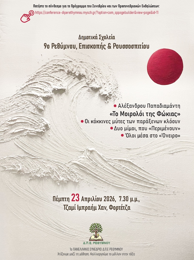 Στα πλαίσια των πολιτιστικών κι εκπαιδευτικών δράσεων του 1ου Πανελλήνιου Συνεδρίου, που διοργανώνεται από την Διεύθυνση Πρωτοβάθμιας Εκπαίδευσης Ρεθύμνου, με τίτλο «Χτίζουμε μαζί τη Μάθηση. Καλλιεργούμε το μέλλον στην τάξη», τρία Δημοτικά Σχολεία: 9ο Ρεθύμνου, Επισκοπής & Ρουσσοσπιτίου, θα παρουσιάσουν από κοινού, την Πέμπτη 23 Απριλίου 2026, ώρα 7.30μμ, στο Τζαμί Ιμπραήμ Χαν, στο λόφο της Φορτέτζας, μια σπονδυλωτή θεατρική σύνθεση με τίτλο: