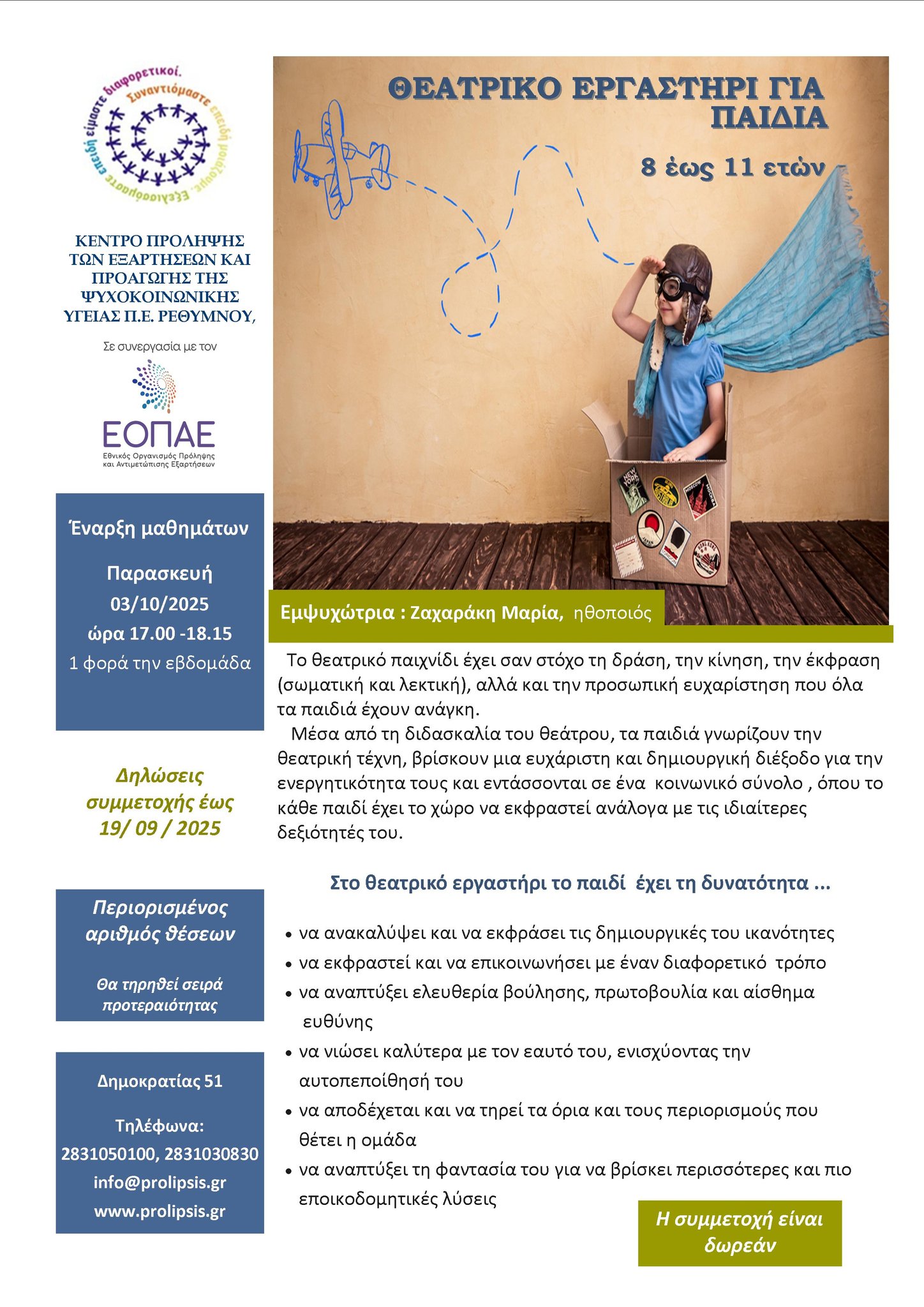 Το Κέντρο Πρόληψης των Εξαρτήσεων και Προαγωγής της Ψυχοκοινωνικής Υγείας Π.Ε. Ρεθύμνου, σε συνεργασία με τον ΕΟΠΕΕ, διοργανώνει θεατρικό εργαστήρι για παιδιά ηλικίας 8–11 ετών.