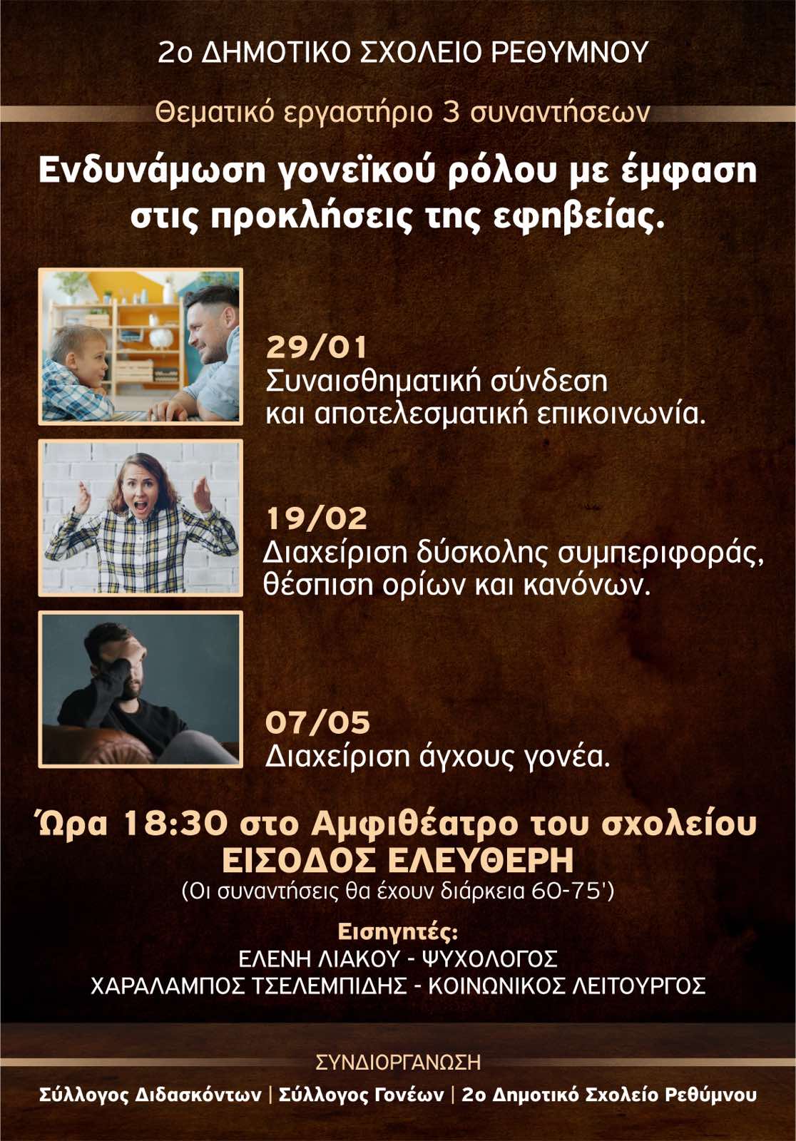 Θεματικό εργαστήριο τριών συναντήσεων με τίτλο: «Ενδυνάμωση γονεϊκού ρόλου με έμφαση στις προκλήσεις της εφηβείας» διοργανώνουν ο Σύλλογος Διδασκόντων, ο Σύλλογος Γονέων και οι εκπαιδευτικοί του 2ου Δημοτικού Σχολείο Ρεθύμνου.