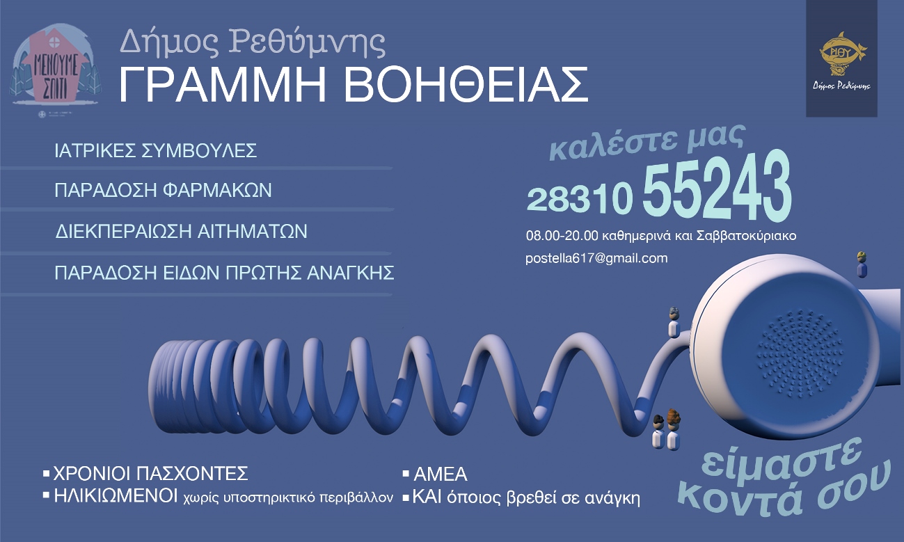 ΕΙΔΗΣΕΙΣ ΡΕΘΥΜΝΟ Τη «Γραμμή Βοήθειας» ενεργοποιεί η Κοινωνική Υπηρεσία του Δήμου Ρεθύμνου Νοέ 12, 2020 FacebookTwitterWhatsAppLinkedinViberTelegramEmail Τη “Γραμμή Βοήθειας” ενεργοποιεί ξανά η Κοινωνική Υπηρεσία του Δήμου Ρεθύμνου, για την διευκόλυνση των συμπολιτών κατά την περίοδο της καραντίνας.