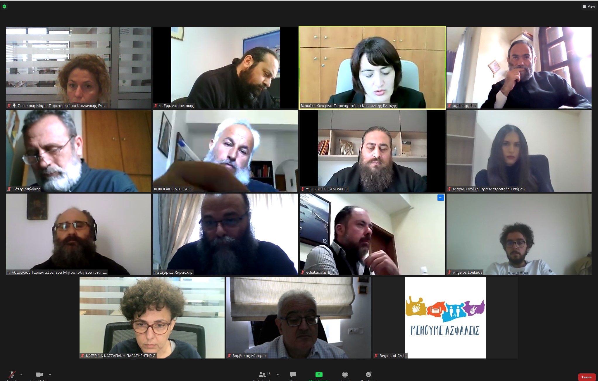 Η τηλεδιάσκεψη πραγματοποιήθηκε παρουσία του Αντιπεριφερειάρχη Δημόσιας Υγείας και Κοινωνικής Πολιτικής, Λάμπρου Βαμβακά, με τη συμμετοχή της Ιεράς Αρχιεπισκοπής Κρήτης και των 8 Ιερών Μητροπόλεων του νησιού. Στη συνάντηση παρουσιάστηκε ο ρόλος του Παρατηρητηρίου στον Εθνικό Μηχανισμό Συντονισμού, Παρακολούθησης και Αξιολόγησης των Πολιτικών Ένταξης και Κοινωνικής Συνοχής και στην Περιφερειακή Στρατηγική για την Καταπολέμηση της Φτώχειας και την Κοινωνική Ένταξη Κρήτης (ΠΕΣΚΕ Κρήτης).