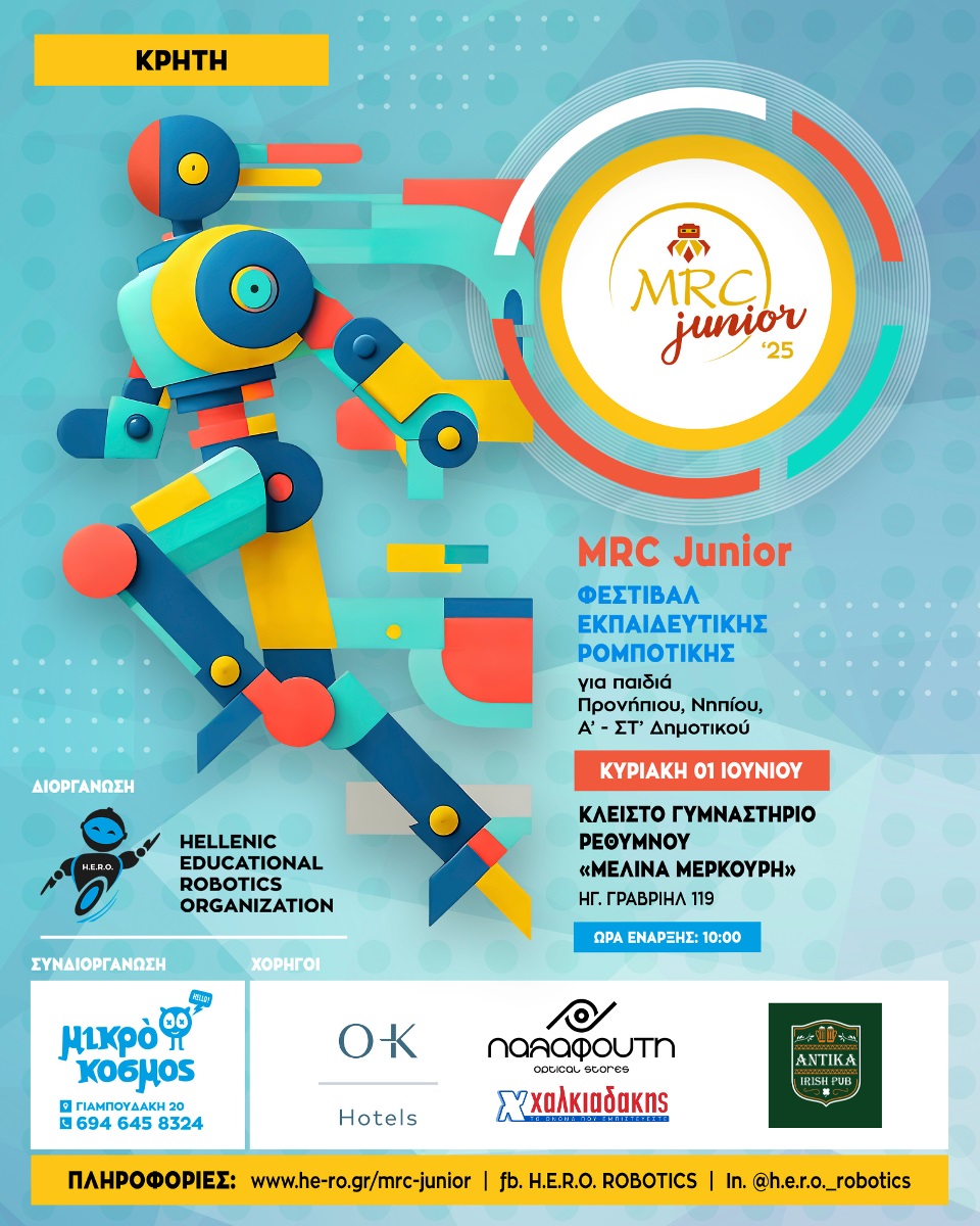 Ο Ελληνικός Οργανισμός Εκπαιδευτικής Ρομποτικής H.E.R.O. σε συνδιοργάνωση με το Κέντρο Εκπαιδευτικής Ρομποτικής «Μικρόκοσμος» διοργανώνουν την Κυριακή 1 Ιουνίου 2025 και ώρα 10:30 π.μ., το Φεστιβάλ Αθλητικής Ρομποτικής “MRC junior 2025”, στο Κλειστό Γυμναστήριο «Μελίνα Μερκούρη» στο Ρέθυμνο.